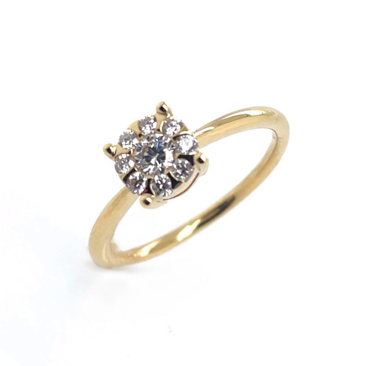Enkel diamant ring i 18kt guld med blank overflade og isat i alt 0,32ct tw/si brillantslebne diamanter i en illusion fatning. Dvs at center diamanten er stører og der er isat mindre diamanter om center stenen så den visuelt får et stører udtryk. De smukke hvide brillanter bidrager med et eksklusivt udtryk, og ringen vil med garanti stjæle opmærksomheden.