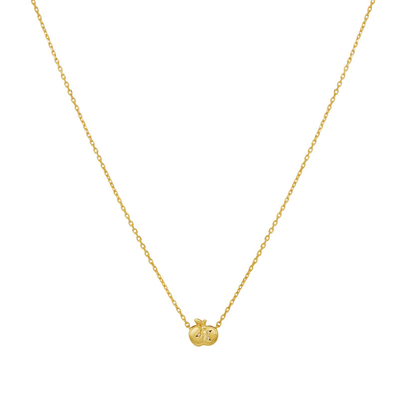Smuk Pamela halskæde fra Maanesten i forgyldt sølv hvor kæden med sit lille æblevedhæng, med garanti fanger opmærksomheden.